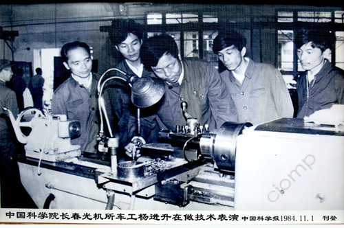 内容:由中科院下属六个研究所工厂在70-80年代,每年举办2-3次学术交流活动,地点在六个研究所之间巡回召开。1984年9月由各研究所派2-3名优秀的技术工人参加表演。此图是长春光机所青年工人杨进升在成都光电所实际操作表演,是唯一被中国科学报报导的工人表演。