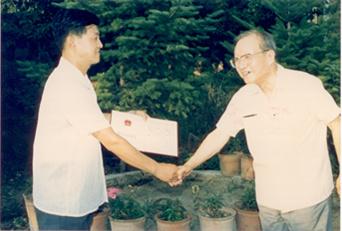 内容:王大珩院士为首届博士毕业生郝德阜办法学位证书