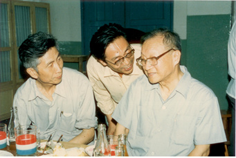 王大珩与原所党委书记蔡仁堂,原研究生部主任高大卿交谈研究生培养质量