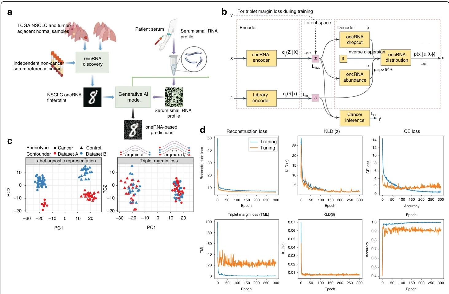 基于致癌 RNA(oncRNA)的液体活检平台及Orion架构。a.基于癌症基因组图谱(TCGA)组织数据集与非癌症对照样本的非小细胞肺癌(NSCLC)致癌RNA(oncRNA)验证图;b. Orion模型架构所需的两个输入计数矩阵示意图;c.三元组边际损失在模拟数据上的应用示意图;d.损失收敛曲线图。