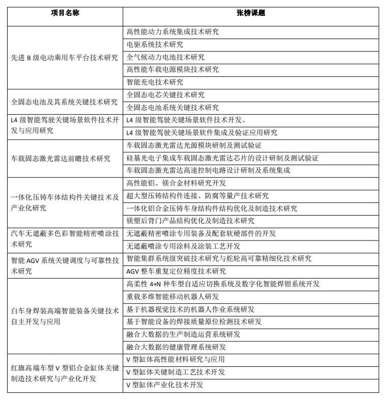 按照吉林省政府、长春市政府决策部署,吉林省科技厅、长春市科技局基于中国一汽“十四五技术发展规划”、吉林省汽车产业发展需求,对一汽集团推荐的9个自主创新(关键核心技术研发)重大科技专项项目(共包含29个课题)进行了专家论证,进一步完善了项目研发目标和技术方案。9个项目的项目负责人由一汽集团自主确定,29个课题为张榜课题,课题参照“揭榜挂帅”机制组织实施。项目及张榜课题如下(项目信息、张榜课题及要求详见附件):