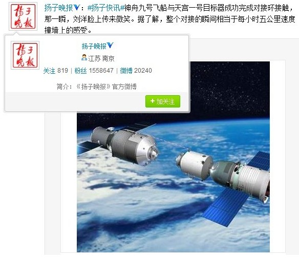 微博认证为“《扬子晚报》官方微博”的扬子晚报6月18日在其微博直播神九与天宫一号交会对接全过程。(证券时报网快讯中心kuaixun.stcn.com)