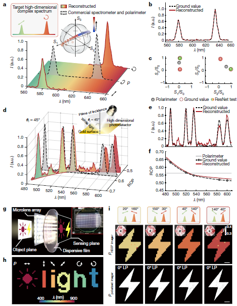 图2.高维光场探测及成像的实验验证。a-c.双色双偏振激光场的高维度探测,d-f.宽带光照射金表面所产生的反射光场的高维度探测,g.高维光场成像仪的结构示意图及照片,h.人造目标的偏振和波长成像探测,i.双色双偏振合成光场的高维度成像探测