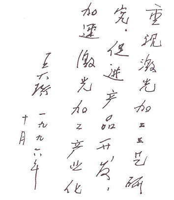 王大珩先生为作者主编的《激光加工工艺手册》题词手稿