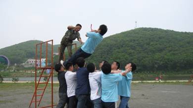 这项任务正是考核我们团队协作的能力,我们的奉献精神。没有我们的“基石”,又有谁能够爬上这高墙,更别说全部队员都爬上去;没有开路先锋又有谁能打开僵局,开创希望;没有舍己为人的最后一位队员,我们又怎样面对最后的全部胜利;没有大家的齐心协力,举起双手形成的保护带,又有谁会如此放心的向上攀爬。大家双手托起的不仅仅是我们可爱的队友,更是托起了我们团队的希望,托出了我们团队的力量。任务完成之后,我们也特别的对这些突出队员表示感谢。