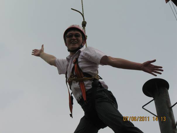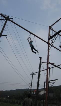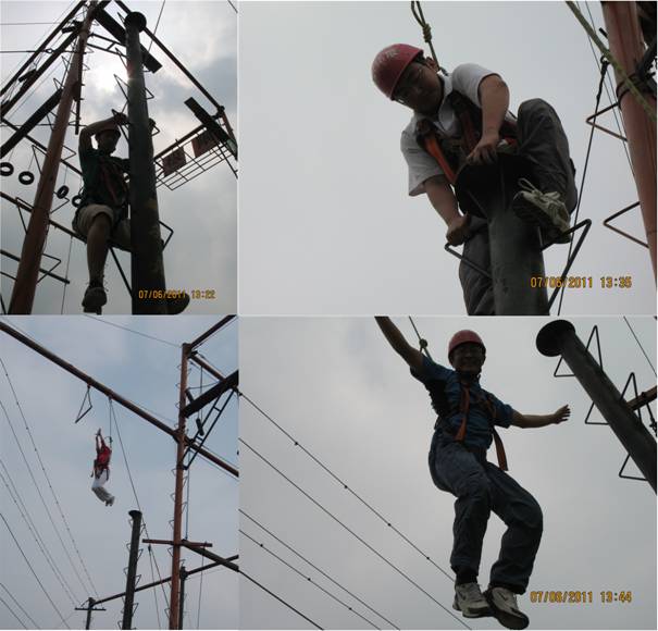 我们几乎每个人都望着高台,考虑着该如何应对这个我们心理上无法完成的任务。终于有人始作俑者,迅速爬上高杆,在爬上高台时却尝试了多次,最终站在了高台之上。在稳了稳晃动的高杆之后,一跃而起,抓住横杆。我们都举起了双手为他庆贺,同时也看到希望,获得经验。紧接着我们一个接着一个的完成了这项任务。但其完成的过程当中,有多少人多少次想半途放弃,但在大家的鼓励和支持之下,都完成任务。大部分人都会在落地之后感慨的说道:我以为我完成不成。还有的说爬到一半就想放弃了,但都在鼓励之下坚持一下最终完成。