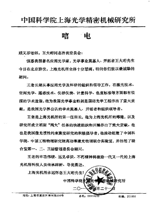 中国科学院上海光学精密机械研究所唁电
