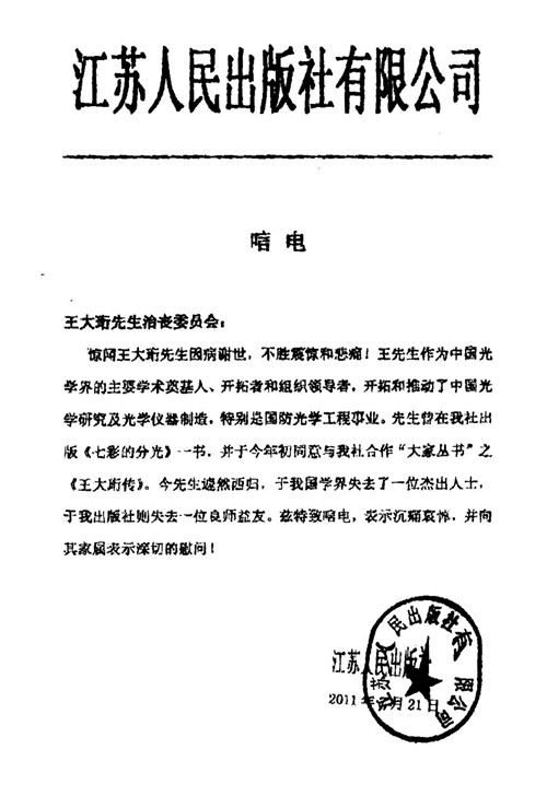 江苏人民出版社有限公司唁电