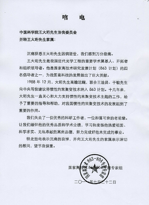 国家高技术863-804专题专家组唁电