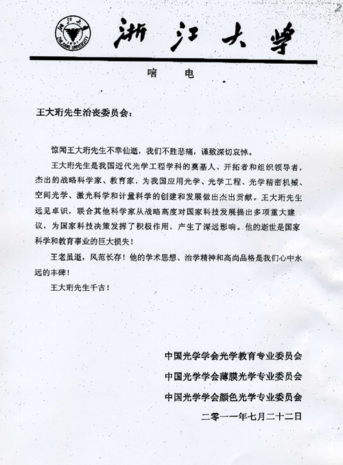 中国光学学会光学教育专业委员会、薄膜光学专业委员会、颜色光学专业委员会唁电
