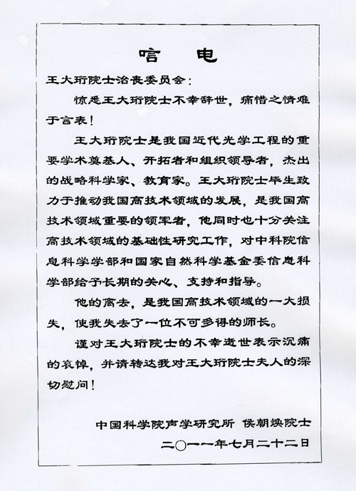 中科院声学研究所侯朝焕院士唁电