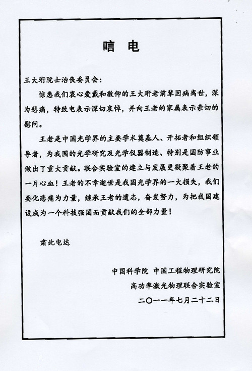 中国科学院 中国工程物理研究院高功率激光物理联合实验室唁电