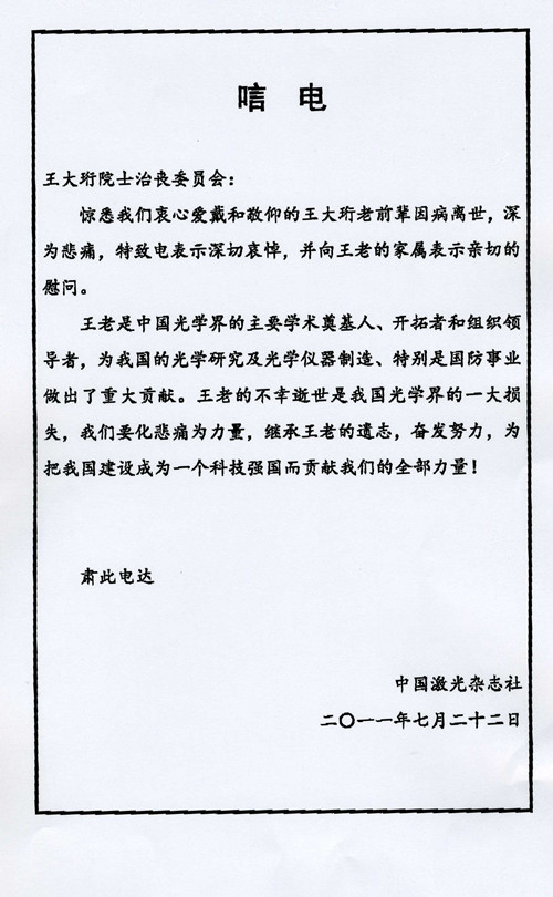 中国激光杂志社唁电