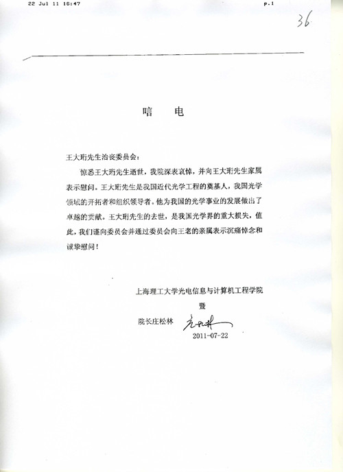 上海理工大学光电信息与计算机工程学院暨院长庄松林唁电