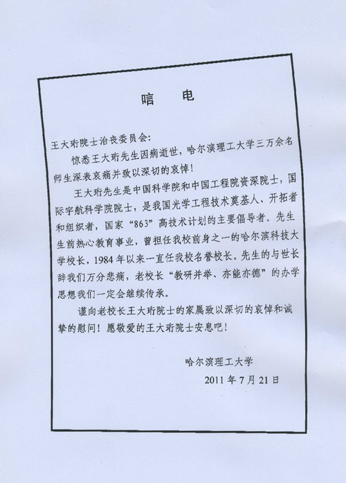 哈尔滨理工大学唁电
