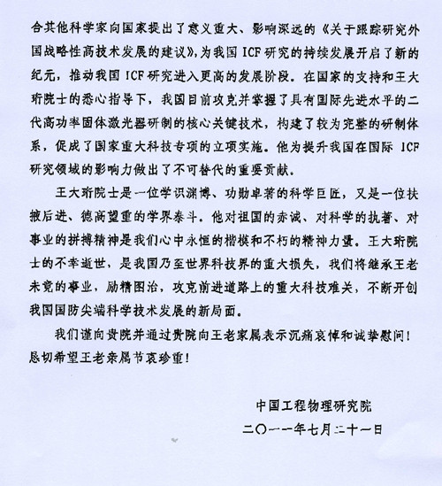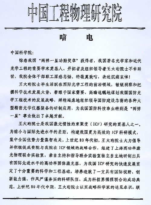 中国工程物理所唁电