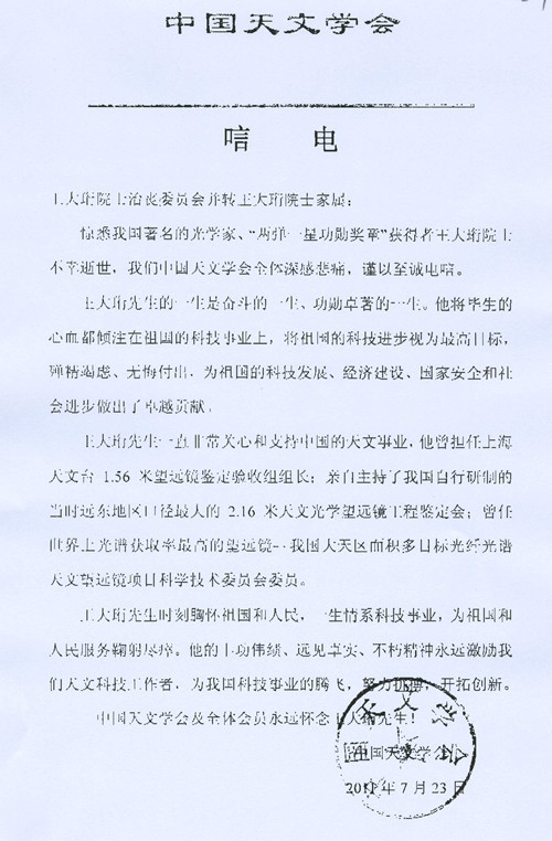 中国天文学会唁电