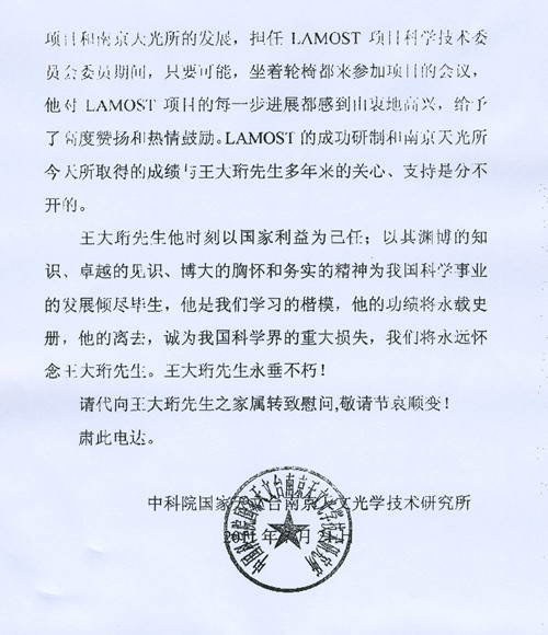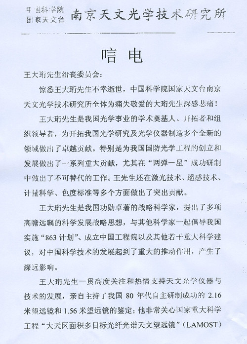 中国科学院国家天文台南京天文光学技术研究所唁电