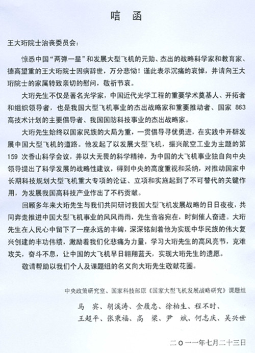 中央政策研究室、国家科技部原《国家大型飞机发展战略研究》课题组唁电