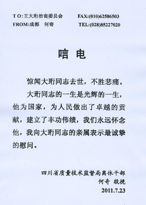 四川省质量技术监督局离休干部 何奇唁电