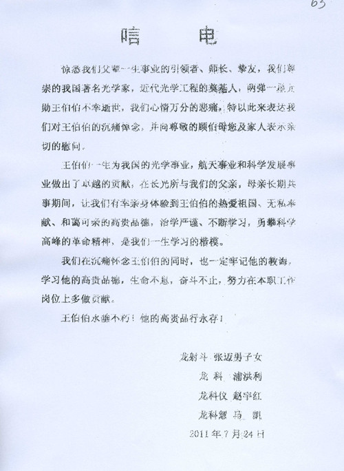 龙射斗家属唁电