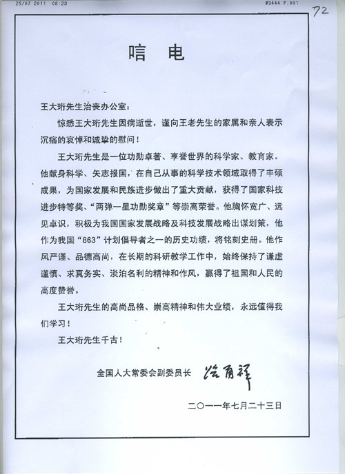 全国人大常委会副委员长路甬祥唁电