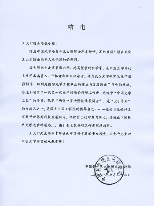 中国科学院光电研究院唁电