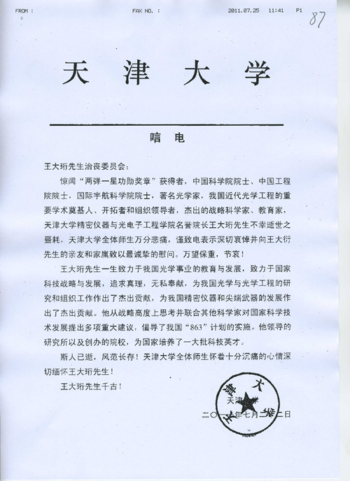 天津大学唁电