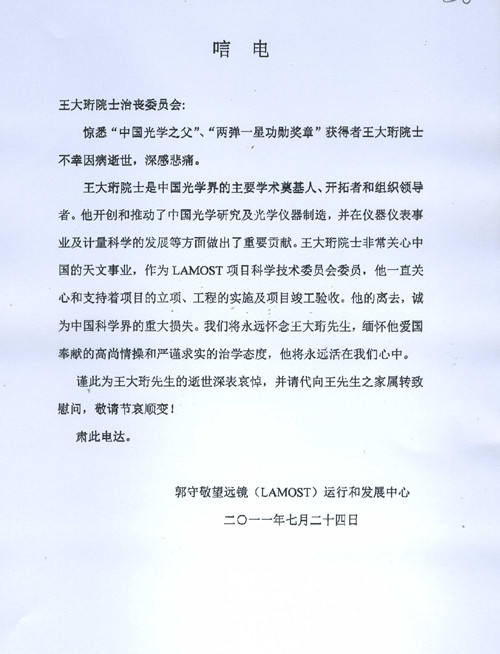 郭守敬望远镜(LAMOST)运行和发展中心唁电