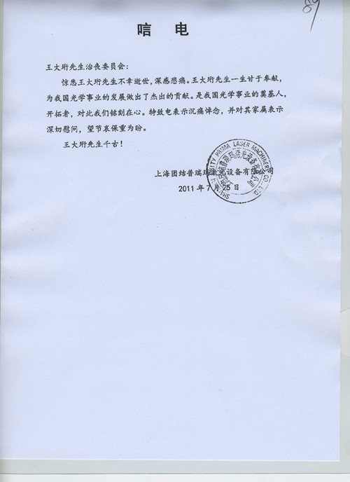 上海团结普瑞玛激光设备有限公司唁电