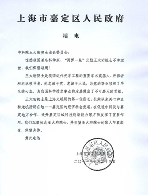 上海市嘉定区人民政府唁电