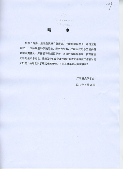 广东省光学学会唁电